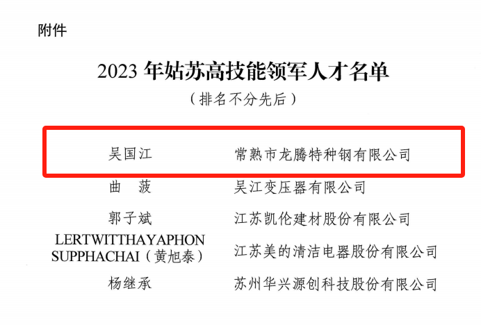 江蘇龍騰特鋼集團有限公司燒結(jié)廠吳國江榮列其中,成為常熟市首位獲評此項榮譽的人才!