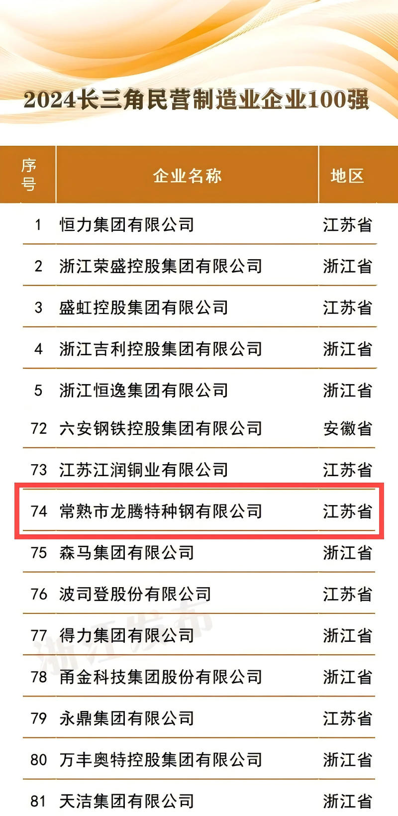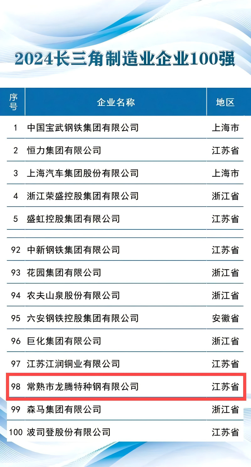 常熟市龍騰特種鋼有限公司位列“2024長三角制造業(yè)企業(yè)100強(qiáng)”第98位;