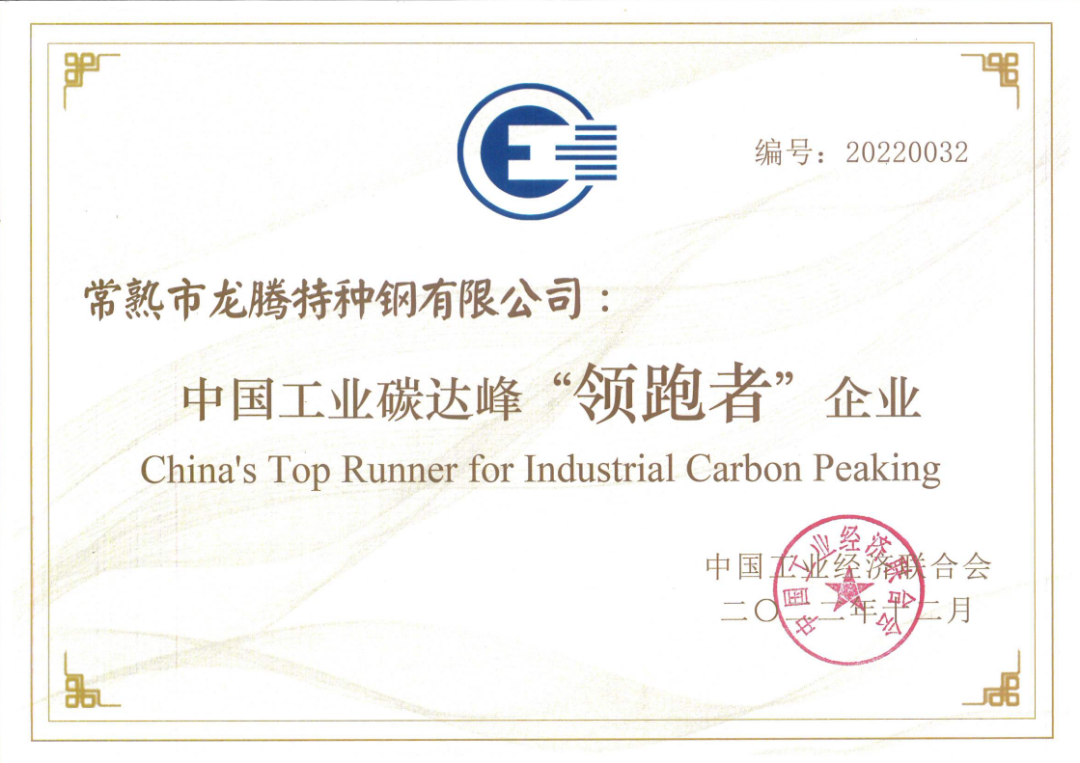 龍騰特鋼榮獲首屆“中國(guó)工業(yè)碳達(dá)峰‘領(lǐng)跑者’企業(yè)”榮譽(yù)稱(chēng)號(hào)